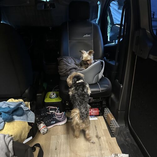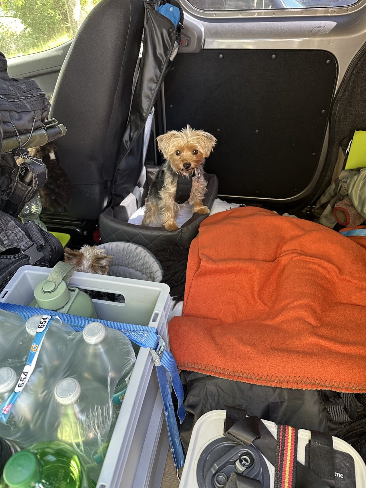 Trotz der anfänglich angenehmen Temperaturen von tagsüber über 20 Grad wurden die Nächte im August im Bayerischen Wald bereits empfindlich kühl. Da unser Campingplatz auf etwa 1000 Metern Höhe lag, fielen die Temperaturen in der zweiten Woche auf unter 15 Grad und nachts sogar bis auf 6 Grad. Daher mussten wir uns leider oft, wenn die Sonne unseren Stellplatz verlassen hatte, in unseren Campingbus zurückziehen. Bereits im August die Standheizung laufen zu lassen, ist eigentlich nicht mein Ding, aber bei einstelligen Temperaturen dann doch nötig. Es ging ja auch nicht nur um uns, auch den Hunden wird es zu kalt.